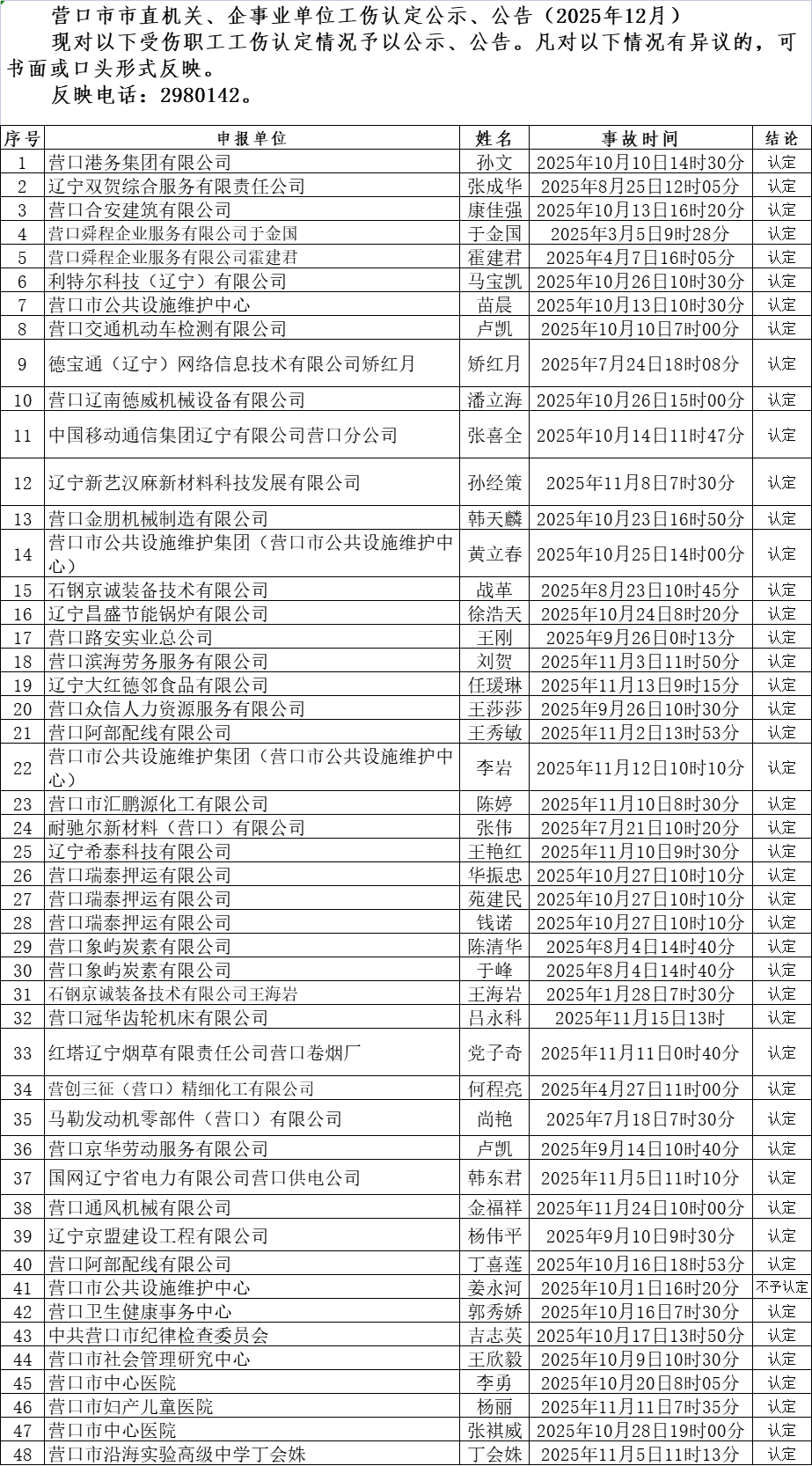 营口市市直机关、企事业单位工伤认定公示、公告(2025年12月)