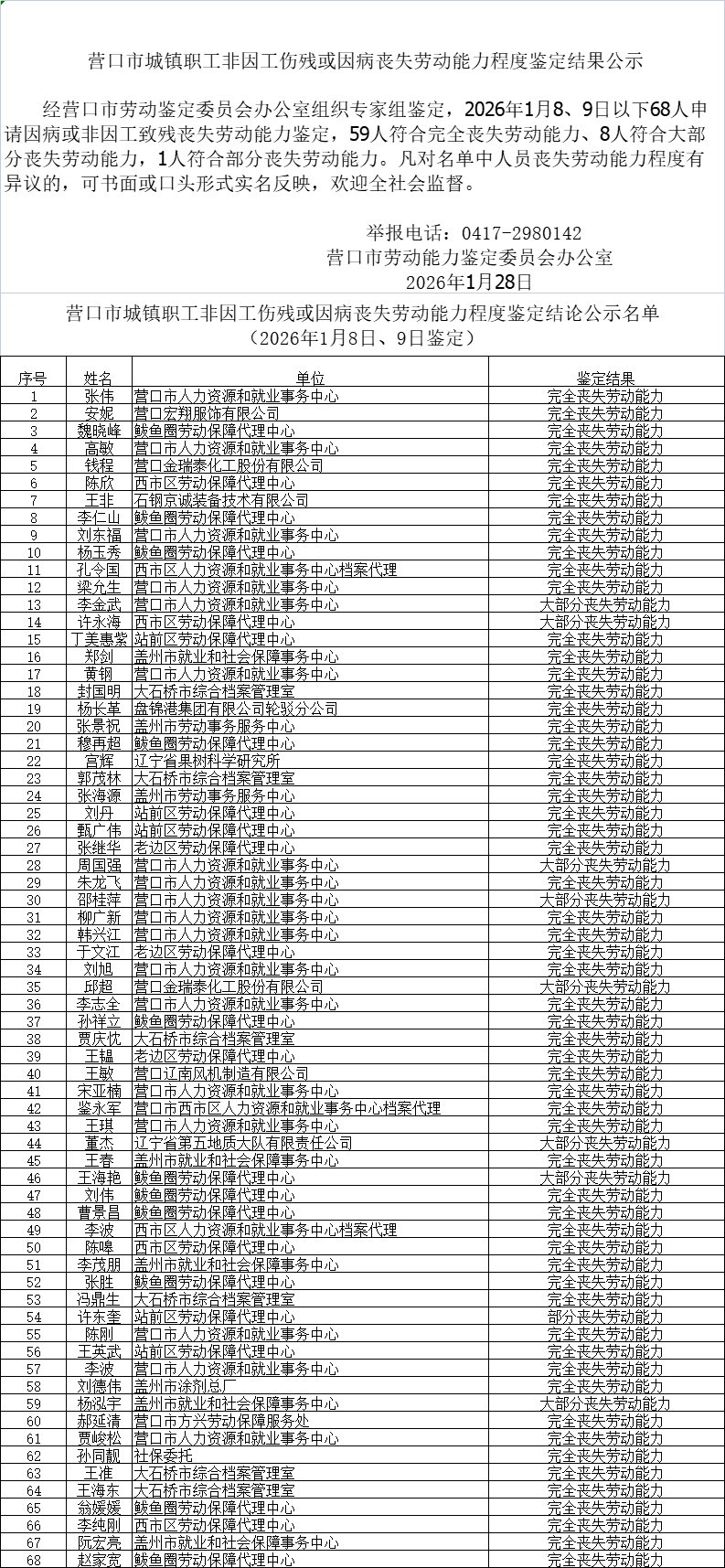 营口市城镇职工非因工伤残或因病丧失劳动能力程度鉴定结论公示名单 (2026年1月8日、9日鉴定)