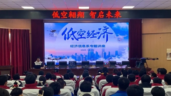 主讲人王磊以低空领域为核心,从发展现状、技术创新与未来趋势三个维度,为同学们展开了详细讲解。他提到,伴随科技进步,低空领域正迎来爆发式发展机遇,其中无人机技术的应用已深度渗透至农业、物流、旅游、应急救援等多个民生与产业领域。既有理论分析,又有实际案例分享,让在场师生对低空经济产业生态有了清晰认知。