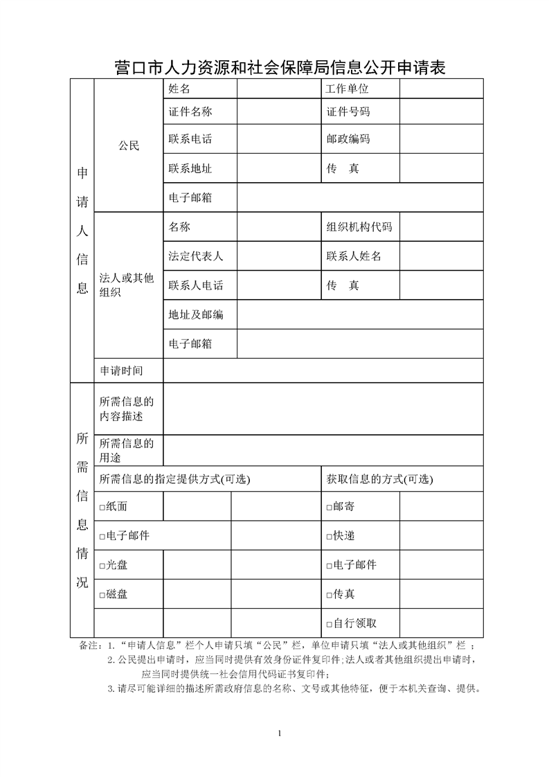 申请人通过现场、信函、传真和电子邮件提出申请的,应填写《营口市人力资源和社会保障局政府信息公开申请表》(以下简称《申请表》,详见附件1),书面《申请表》可在市人社局办公室领取或从门户网站信息公开指南下载打印。
